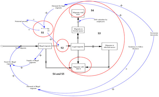 Overall, this study employed a qualitative analysis with a concept of systems thinking to explore the mechanism and contextual factors involving in migrant health policies, ranging from the NV process to insurance measures. This study also demonstrated interactions of key elements in the system of migrant health policies that determine access to public health insurance in low-skilled migrant workers in Thailand. Five subthemes emerged and then served as inputs for developing CLD and SFD in the later part of the study. It is clear that the high labour demand, particularly in ‘3D’ jobs (dangerous, dirty, and demeaning), to address economic necessity is the main factor that drives a high influx of migrant workers [9,27,29]. Therefore, the private sector has a dominant role in maintaining the labour flow and has a strong power influencing the labour demand [33,41].