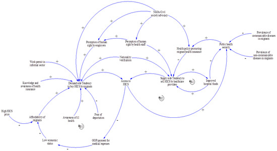Furthermore, the linkage between HICS and public health security could be observed as an accelerator to the likelihood of the HICS selling. The concern over spreading certain infectious diseases from migrants to the wider Thai public (such as tuberculosis, HIV, syphilis and malaria) was a major factor which encouraged providers to sell the HICS [35,36,37,38,39,40]. As a result, the relationship in access to the HICS and public health security was positive as shown in R2 in the CLD. In addition, NGOs and civil society from domestic and international organisations also played an active role in coordinating with government departments, employers, and employees to build trust and advocate social programmes related to human right and health in migrant communities [33].