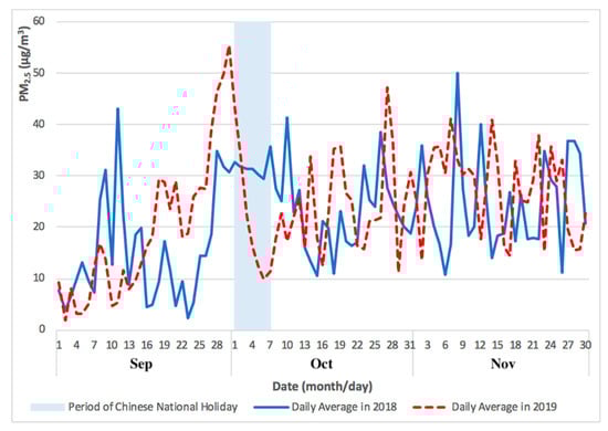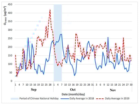 As shown in Figure 1 and Figure 2, the levels of PM2.5 and O3 MAX concentration peaked immediately before, and during, the Chinese National Holiday in late September and early October 2019. The monthly mean concentration of PM2.5 (from September to November) during the Chinese National Holiday in 2019 was 19 μg/m3, 24 μg/m3, and 28 μg/m3, respectively. In addition, the monthly mean concentration of O3 MAX (from September to November) during the Chinese National Holiday in 2019 was 181 μg/m3, 163 μg/m3, and 172 μg/m3, respectively.