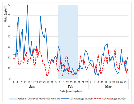 Comparison of PM2.5 concentrations for Taipa Ambient during the previous year of 2019 and COVID-19 pandemic in 2020 (January to March).