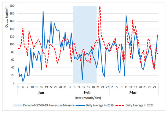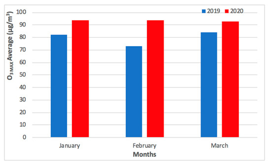 Monthly mean O3 MAX concentrations for Taipa Ambient during the previous year of 2019 and COVID-19 pandemic in 2020 (January to March).