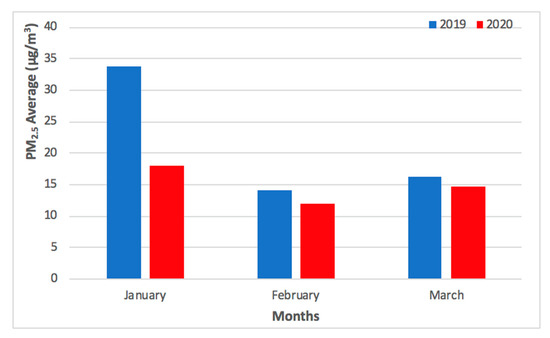 Monthly mean PM2.5 concentrations for Taipa Ambient during the previous year of 2019 and COVID-19 pandemic in 2020 (January to March).