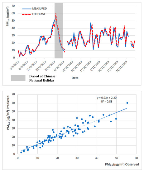 Observed and predicted PM2.5 concentrations for Taipa Ambient during Chinese National Holiday (from September to November 2019).