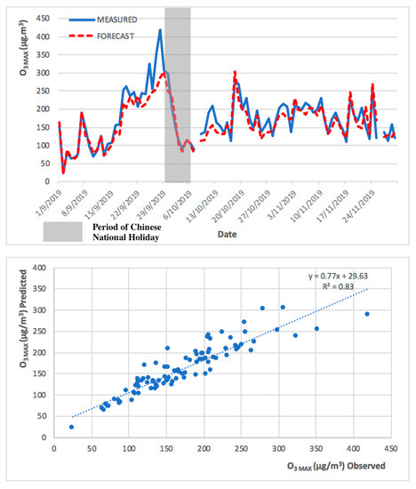 As shown in Figure 7 and Figure 8, the levels of PM2.5 and O3 MAX concentration peaked during late September and early October 2019. The PM2.5 predicted levels followed the primary trend of the measured concentrations and followed the concentration peak represented in Figure 7. The model for O3 MAX also followed the primary trend, but it was more difficult to represent the concentration peak. The forecast model for PM2.5 has a higher R2 in comparison to the model of O3 MAX, because the maximum hourly concentration of O3 MAX is more challenging to predict in comparison to the 24 h average of PM2.5, as there is influence from the regional precursors sources and also its complex chemistry with solar radiation for O3 formation, which led to a higher degree of variability.