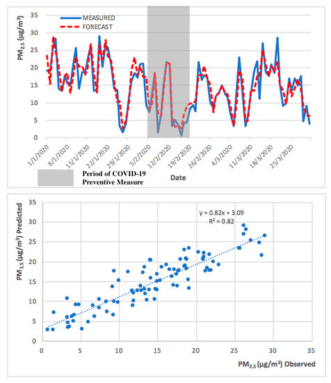 Due to the different nature of PM2.5 and O3 MAX, the forecast model performed better in the prediction of PM2.5 in comparison to O3 MAX. This can be demonstrated in the higher R2 values in the PM2.5 forecast model. The observed and predicted PM2.5 and O3 MAX concentrations, during the low pollution episode (implementation of COVID-19 preventive measures), are presented in Figure 9 and Figure 10.