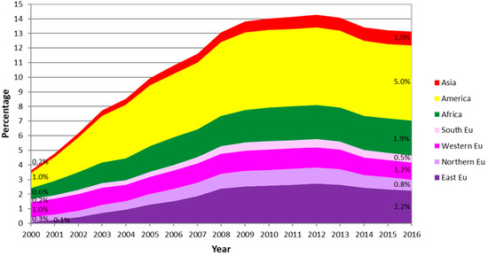 The population resident in Spain has increased from 40,499,791 in 2000 to 46,557,008 in 2016. In 2000, the immigrant population was 1,472,459 (3.6%), and it was 6,123,769 (13.2%) in 2016; the increase during this period was +316%. This growth in the immigrant population shows differences according to the region of birth (Figure 1). The regions of origin that experienced the greatest growth were Eastern Europe (with an increase of +3161% between 2000 and 2016), Asia (+534%), America (+478%), and Africa (+258%).