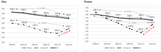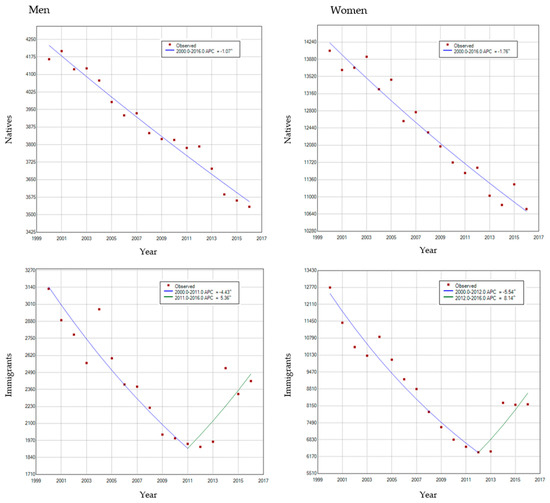 Two different strategies were also considered for the analysis of trends and their changes. On the one hand, the annual trends and the ASR inflection points were analyzed throughout the entire period using Joinpoint regression models for each sex and origin (native/immigrant) as well as for all specific regions of birth. For each identified trend segment, the annual percentage change (APC) of the ASR was calculated with its corresponding CI 95%. A negative APC will indicate a downward trend, while a positive APC indicates an increase in the ASR trend. The Joinpoint Regression Program v4.6.0.0 [24] was used to construct the model and trend graphs. Secondly, in order to provide greater stability to the data, the entire analysis period has been divided into six study sub-periods: 2000–2001, 2002–2004, 2005–2007, 2008–2010, 2011–2013, and 2014–2016. The percentage change in the ASR between the last sub-period (2014–2016) and the rest of the sub-periods of analysis were calculated.