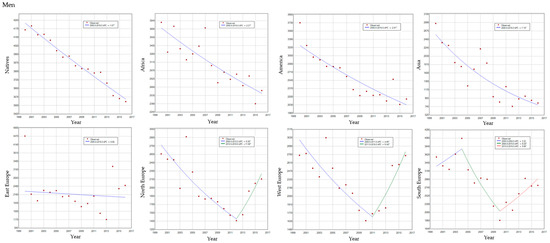 When analyzing the ASR disaggregated by region of origin (see Table 1), in men, it can be observed that all immigrant groups had lower rates of cancer mortality throughout the period vis-à-vis the native population. In the case of women, those from Asia, America, Africa, and the South and East of Europe had higher ASR at the beginning of the period, but this reduced over time. Depending on the region of origin, the majority of immigrant groups experienced a significant decrease in mortality rates concerning the first sub-period, except for men from Eastern, Western, and Southern Europe and women from Eastern, Northern, and Western Europe. This relative decrease observed in ASR in immigrant men ranges from 19.5% (Northern Europe) to 64.8% (Asia), showing also significant declines in those from Africa and America. In the case of women, the decrease ranged from 28.3% in those from America to 64.1% in the Asian population. Those from Africa and Southern Europe also showed significant declines in ASR. When analyzing the shift in the cancer mortality trend of the last period (2014–2016) as compared to 2011–2013 according to the region of origin, a significant increase has been observed in the four European regions in both men and women (except for immigrants from Southern Europe).