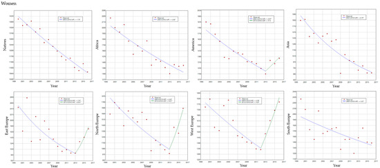 Figure 3 and Figure 4 show the significant changes in the annual trend of cancer mortality in the immigrant population in both sexes, while in the native population, there is a progressive decrease throughout the entire period of analysis. In Figure 3, the significant increase in cancer mortality in the immigrant population is noticeable. This increase has occurred since the year 2011 in men and since 2013 in the case of women. In Figure 4, it can also be seen that in the case of immigrant men, the shift in the trend of cancer mortality was particularly due to the increase in ASR in men from the Northern European regions (+11.8%), the Western (+10.4%), and the Southern (+5.9%). As regards women, this increase can also be observed in those from the European region (East + 25.7%, North + 16.6%, and West + 8.3%) and America (+5.1%) respectively.