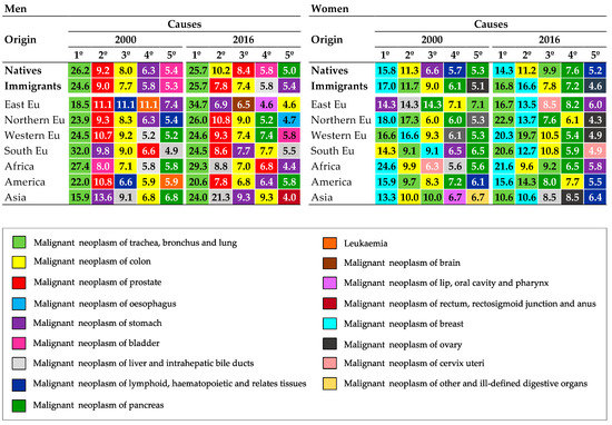 Proportional mortality, five main causes of death by type of cancer in men and women (natives and immigrants) according to region of birth, in 2000 and 2016.