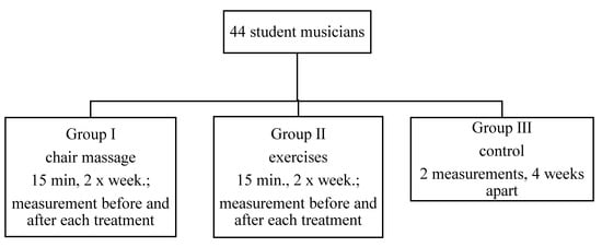 After obtaining the consent of the Senate Ethics Committee for Scientific Research (SKE 01-61/2017), 44 students of The University of Music, comprised of 30 women and 14 men, were included in the study. Each participant was informed about the purpose and procedure of the research, as well as the possibility of resigning from participation at any time during the study. All participants gave their informed consent to participate in the project. The participants were constituted a convenience sample and were assigned to three groups: group I-massage on a chair-16 people, group II-exercises-14 people, group III (control group)-14 people. The groups did not differ in terms of weight, height, daily time of playing the instrument, duration of play in years, or reported pain, the results are presented in Table 1.