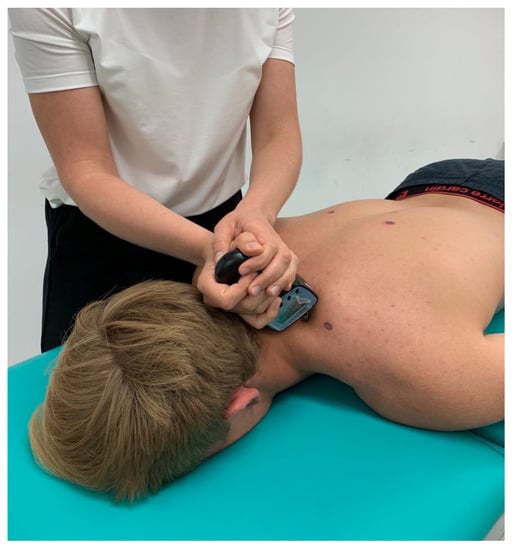 Algometric measurements were made as an objective assessment of the treatments carried out before and after each therapeutic session. The algometric measurement concerned the assessment of muscle pressure sensitivity-pain threshold in kg/cm2 made using the Pain Test FPX Algometer (Wagner). Algometric measurement is an effective computational tool for myofascial pain [,,]. The measurements were made at 6 muscle trigger points on the right and left side of the body: trapezius (descending/upper part), levator scapulae, and trapezius (ascending/lower part). After palpating the trigger points of the mentioned muscles, according to Nie et al. 2005 methodology [], they were marked with dots using a special marker. The measurement was always performed in the prone position (the face was placed in the table opening with upper limbs along the torso), applying the device at a 90-degree angle, always starting from the points on the right, as illustrated in Supplementary Figure 2. The patient was asked to say “stop” at the moment of feeling pain at the point under examination. The result was read by the investigator after the measurement. The temperature, noise, and lighting in the room were always constant.