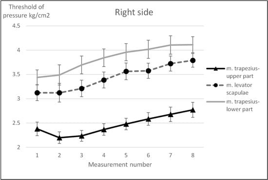 Changes in pain sensitivity of the examined muscle trigger points on the right side (Mean, SE).