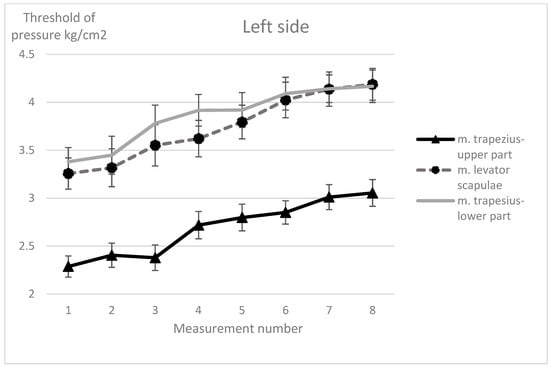 Changes in pain sensitivity of the examined muscle trigger points on the left side (Mean, SE).