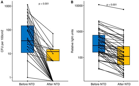 | Microbiological Assay (CFU/100 cm2) | ATP Bioluminescence Assay (RLU) | ||||