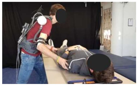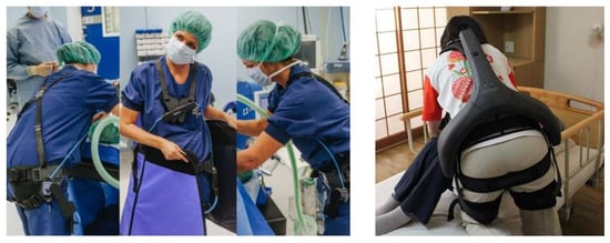 The last decade has seen an increasing number of commercial and research initiatives addressing the development of occupational exoskeletons [,]. Occupational exoskeletons can be either passive or active; passive exoskeletons only use unpowered mechanisms such as a spring to generate the supporting forces while active ones involve powered force/torque generating elements such as motors []. Most of the occupational exoskeletons are intended for usage in industrial applications, such as in the automotive industry for overhead assembly (exemplary devices are Skel’Ex, Paexo Shoulder, Levitate, Mate and ShoulderX []) or in the logistics for parcel handling (exemplary devices are SoftExo [], Paexo Back [] and Cray X []). Only a limited number of them were considered so far for caretaker support in healthcare applications. These include mostly hip support exoskeletons such as the passive exoskeleton Laevo [] for static holding applications in surgery (see Figure 1) and the Atoun Model Y [] for manual patient handling and other daily living healthcare applications. Regarding upper limb support, [] evaluated for instance a passive upper-limb exoskeleton in a static laparoscopy operation procedure in the lab and test operation environment. Pain and fatigue in the shoulder area were considerably reduced without significantly interfering with operative skills or manual dexterity.
