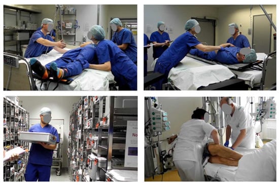 Typical manual handling scenarios identified and investigated in a preliminary workshop with hospital personal. Upper left: manual patient transfer in the post-op waiting room, upper right: manual patient transfer in the pre-op waiting room, lower left: manual handling in the logistics operation area, lower right: manual patient transfer in the intensive care unit (Diakonie-Klinikum Stuttgart, photos taken on 28 March 2019).