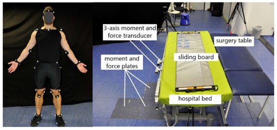 To approximate the biomechanical strain based on a musculoskeletal model, the surgery assistants’ body motions, ground reaction forces and bed reaction forces were measured. Kinematics were collected by attaching 41 markers on the segments of the body of the subjects and using 12 optical motion capture cameras (Qualisys) with a sampling frequency of 100 Hz to capture full-body movement. The cameras were adjusted on the relevant task area in order to capture the motion precisely and to reduce the risk of occluded markers. Polynomial spline interpolation was used during post-processing in order to fill the gaps in the marker trajectories, which were a result of marker misdetections during measurement. Furthermore, ground reaction forces and reaction forces from leaning against the hospital bed were collected using 6-axis force plates (AMTI) and 6-axis force-torque sensors (Sensix).
