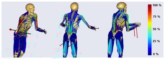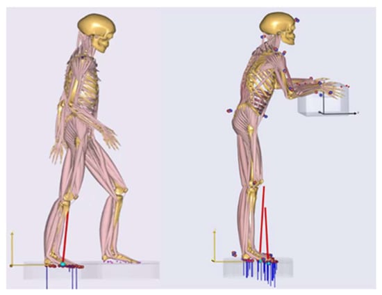 In discussion with ergonomics and biomechanical experts of the department Biomechatronic Systems of the Fraunhofer Institute representative muscle groups and joint loads were chosen and analyzed for each posture-representative model. To reference the computed joint loads natural biomechanical activities focusing on a specific body region where considered. Joint loads were determined by using simulation results and quantities of in vivo force measurements []. Figure 5 left shows the gait model in AMS, which quantified reference knee compressions for walking with a normal speed. The model for the calculation of the kinetic elbow and back references as lifting a 20 kg box in an upright standing posture is illustrated in Figure 5, left. The reference musculoskeletal models were both a 50th percentile European male. Ground reaction forces were predicted by the AMS [] (see Figure 5). Further, the setup of the in vivo measurement of [] where the participant performed a shoulder abduction of 45° with 2 kg weight in order to quantify the resultant force in the glenohumeral joint (GHJ) was taken as shoulder load reference. Muscle activities are referenced in their percentage distributions.