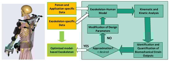 - Tröster, M.; Schneider, U.; Bauernhansl, T.; Rasmussen, J.; Andersen, M.S. Simulation Framework for Active Upper Limb Exoskeleton Design Optimization Based on Musculoskeletal Modeling. In Proceedings of the 2018 Smart ASSIST, Technische Unterstützungssysteme, die die Menschen Wirklich Wollen, Hamburg, Germany, 11–12 December 2018; pp. 345–353. [Google Scholar]