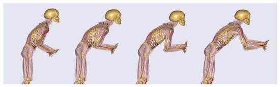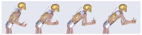 After the optimization of the designed shoulder–arm mechanism, the exoskeleton was evaluated in order to investigate its biomechanical effectiveness and impact on the whole human body. For that purpose, the case of the pushing task with the highest external hand forces over all three participants (250 N) and an actuator torque of up to 30 Nm were used. Single frames of the simulated dynamic motion with the starting, two middle and the ending pose are shown in Figure 15. Here the resultant GHJ forces and the muscle activity of the deltoid were taken as the most representative biomechanical outputs to represent the loading of the shoulder–arm system.