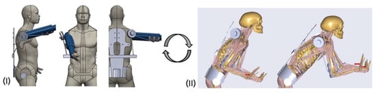 The concepts were optimized within two modeling frameworks: (I) a static exoskeleton–human designenvironment and (II) a musculoskeletal modeling framework, which are both considering conceptual exoskeleton designs. Within the digital frameworks virtual static range of motion tests (Figure 8 left) and dynamic tests with anatomic movements in a biomechanical more sophisticated framework (Figure 6 right) are executed.