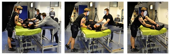 Manual handling tasks reproduced in the motion lab (left: pushing in a team; middle: pushing with less help and right: manually lifting the patient´s legs).