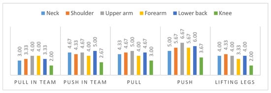 The questionnaire collects subjective perceived strain in a score from zero to eight (less to strong strain) for each body region. Figure 10 illustrates the average results of the three subjects within two trials for each scenario. The results indicate high strains for the lower back (maximum score of 6.0) and the shoulder–arm-system, represented by the upper arm strain (maximum score of 6.67). In comparison to the lower extremities, represented by the knee strain, that were perceived as less loaded. The highest perceived strain occurred in the upper arm during pushing alone and in a team.