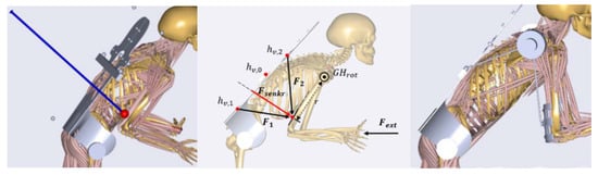 The exoskeleton mechanism design is iteratively optimized by adapting design parameters in the CAD environment, certifying the range of motions and further proving biomechanical effects in the second framework and vice versa. After the exoskeleton CAD-design is optimized by certifying the range of motion of the mechanics and increasing the biomechanical effectiveness, the next step in the model-based workflow is the evaluation of the exoskeleton in order to investigate the overall biomechanical impact of the device on the musculoskeletal apparatus of the human body. It is important to guarantee that the designed exoskeleton mechanics supports the body in a proper way without leading to an increased loading of surrounded tissue and segments of the human body. Therefore, the muscle activations and joint forces are compared for the movement with and without the designed exoskeleton in AMS. In order to interpret the data in an ergonomic way, a baseline or reference value of the musculoskeletal loading are considered. Therefore, recommended hand forces of the German “Mounting-specific Force-Atlas” [] applied on the 15th male percentile were used to generate reference values for an acceptable loading during the examined movement. A work planner normally uses this method to make sure that above the 15th male percentile every worker can execute a force-intensive work task. The evaluation method generates recommended maximum hand reaction forces, which should not be exceeded and which are taken as boundary conditions to compute references for acceptable body loadings. This approach is applied to the most relevant load scenario.
