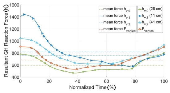 Figure 13 shows that the position of the attachment point (h) greatly influenced the magnitude of the resultant GHJ reaction force, especially in the initial phase of the push motion (normalized time < 20%). In the later phases the sensibility to this parameter decreased and at normalized time = 60%, the reaction force was nearly the same for all the parameter values. The attachment configuration with the lowest average joint reaction force over the sequence was the configuration with an attachment point at 26 cm, measured from the bottom of the back plate and was selected as the biomechanically most effective position (Figure 12 right).