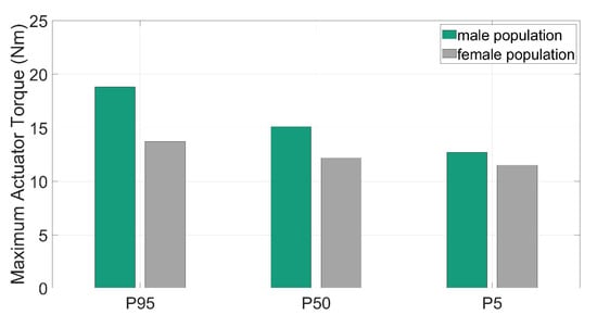 To define the requirements for the exoskeleton drive module a further optimization was applied to find the amount of supportive torque needed for the design load scenario. The torques were quantified with AMS for different populations with variable recommended maximum hand forces for the specific movement based on from occupational ergonomics experts recommended forces []. These are represented in Figure 14 for male and female individuals (5th, 50th and 95th percentiles) together with the corresponding hand reaction forces.