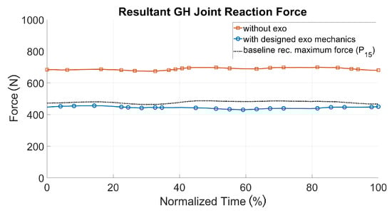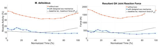 Figure 16 shows the simulation results for the two biomechanical output values during the pushing task with and without the exoskeleton, together with the baseline of recommended hand forces for the 15th percentile [] for an acceptable loading. The GHJ force was significantly reduced with the optimized shoulder–arm exoskeleton: its maximum value was decreased from 1821 to 573 N, which corresponded to a drop of more than 70%. The average muscle activity of the deltoid was also reduced by more than 25% during the same sequence. As a result, the simulated exoskeleton support led to a significant decrease in shoulder loading, up to a range of values comparable to those of the baseline for acceptable loadings. The strain of the shoulder complex in the pull scenario could be decreased as well (see Figure 17). Therefore, a recommended pull force of 52.5 N [] for each hand was taken as an external force for modeling reference purposes, in comparison to 70 N (each hand) for the patient handling scenario with and without the exoskeleton.