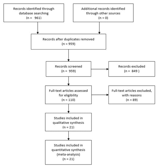 - Moher, D.; Liberati, A.; Tetzlaff, J.; Altman, D.G. Preferred reporting items for systematic reviews and meta-analyses: The PRISMA statement. BMJ 2009, 339, 332–336. [Google Scholar] [CrossRef]