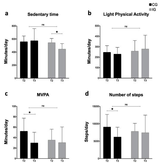 | Accelerometry | All (n = 17) | CG (n = 10) | IG (n = 7) | |