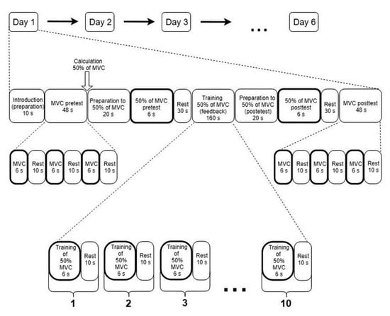 The experiment was performed one time per day during six consecutive days at approximately the same time and with an equal training program each day (Figure 1). We asked participants to follow the prompts displayed on the computer screen, on which necessary commands and information about the time remaining until subsequent tasks were given. At the beginning of the experiment, all individuals performed three MVCs (pre-test). After a rest period, participants were instructed to execute the performance pre-test. The result of the pre-test was the performance error (PE) for an individual, which was calculated as the size of the deviation from the expected value (50% of MVC: pre-test) as expressed in percentages.