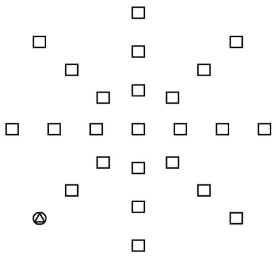 Useful field of view task, the task was modeled after that used by Green and Bavelier [2]. For each trial, 24 stimuli (23 distractors and one target) were presented on the eight spokes of a virtual radial array at 10°, 20°, and 30° from the center of the display. The target was a triangle embedded in a circle; the distractors were unfilled squares (Figure 1). For each trial, a fixation cross appeared in the center of the screen. Then stimuli were presented for 17 ms, followed by a 500 ms visual mask, and then a fixation cross until a response. Individuals pressed one of eight keys to indicate the spoke on which the target appeared. The response-to-stimulus interval was 1000 ms. Participants were instructed to give their best guess when they were unsure of the target’s location. The task included 24 practice trials and 96 test trials. The target appeared at each of the 24 locations equally often. The performance measure represented the percentage of correct choices collapses across distance and spoke.
