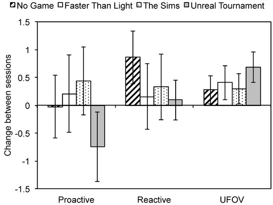 Effects of game training on visuo-spatial processing, proactive, and reactive control. Proactive: proactive control, Reactive: reactive control, UFOV: useful field of view. The error bars represent the 95% confidence interval.