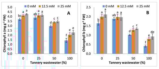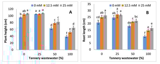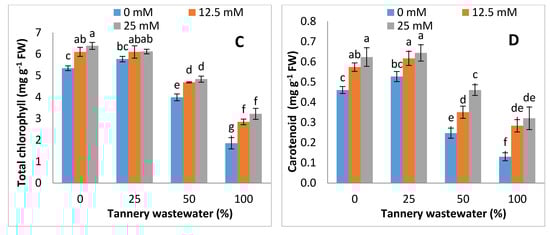 Maize (Zea mays L.) is one of the main crop of Pakistan and worldwide. It is usually sown in April-June, and harvesting is done in October []. In Pakistan, maize is vital cereal crop after rice and wheat. []. It is of high nutritional value, containing protein, starch, fiber and other micronutrients []. There are almost 800 tanneries in Pakistan [], and these tanneries contain high levels of chromium (Cr), and other nutrients, such as potassium dichromate, are used during the tanning process []. Tannery industries release waste containing toxic chemicals, including high amounts of sulfides, Cr and many other chemicals [,]. Tannery wastewater is used for irrigation in Pakistan, as it has nutrients that promote plant growth. At low concentration, tannery wastewater promotes plant growth, whereas at high concentration, it induces toxicity in plants. As tannery wastewater contains a high amount of iron, manganese, zinc (Zn), Cr, alkanity, COD (chemical oxygen demand), BOD (biological oxygen demand) and total dissolved salts, irrigation causes the severe damage in plants. At high concentrations, tannery wastewater can decrease the plant biomass and seed production. length of root and shoot, root and shoot dry biomass, total leaf area, chlorophyll a, chlorophyll b, total chlorophyll, protein and amino acids are also affected with tannery wastewater [,]. Many studies have reported that Cr caused negative effects on plants, and results in oxidative stress and growth inhibition [,]. Cr induced the lipid peroxidation in plants which results in harm to cell membranes. This also results in the degradation of photosynthetic pigments in plants, which also affect plant growth [,,]. Irrigation with tannery wastewater may decrease photosynthetic pigments in plants prominently chlorophyll synthesis. Chromium toxicity in plants reduced the photosynthesis activity of plants, and it also changed the chloroplast structure [,,].