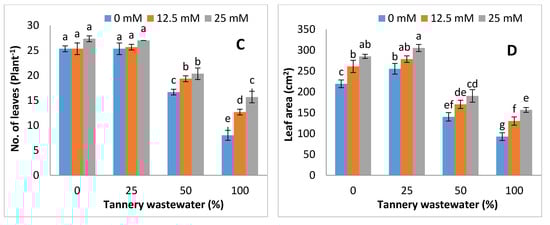 Graphs showing the effect of foliar spray of zinc chelated lysine (0, 12.5, 25 mM) on plant height (A), root length (B), number of leaves (C) and leaf area (D) of maize plants growing under 0, 25, 50, and 100% concentration of tannery wastewater. Values are means of three replicates. Statistical analyses were carried out by ANOVA, followed by Tukey’s Post-Hoc test.