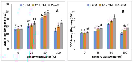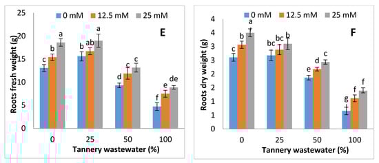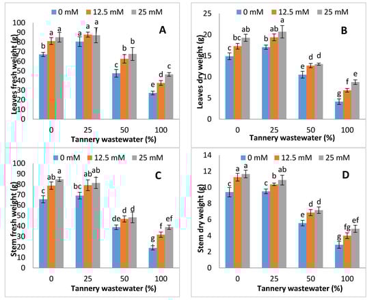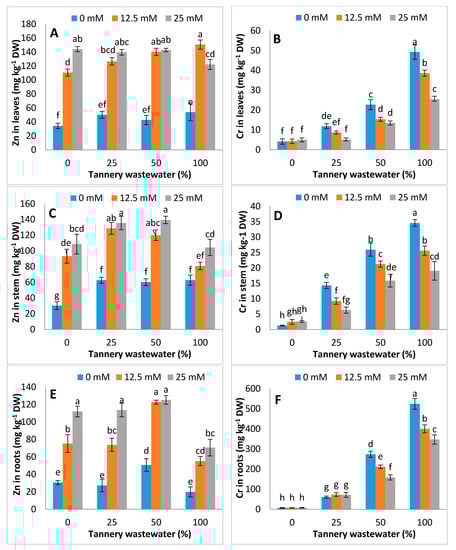 The biomasses of stem, leaves and roots (fresh and dry) were substantially lowered under tannery wastewater application, and such reductions were more severe, with increasing the tannery wastewater concentration, except at 25%, whilst exogenous Zn-lys application improved the fresh and dry biomass, either with or without tannery wastewater treatments. The highest fresh and dry biomass was recorded in Zn-lys application at 25 mM dose under control, and each tannery wastewater treatment (Figure 2).