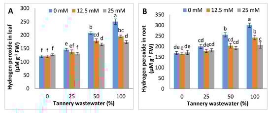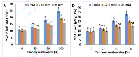 Graphs showing effect of foliar spray of zinc chelated lysine (0, 12.5, 25 mM) on hydrogen peroxide and MDA in leaves (A,C) and roots (B,D) of maize plants, growing under 0%, 25%, 50%, 100% concentration of tannery wastewater. Values are means of three replicates. Statistical analyses were carried out by ANOVA, followed by Tukey’s Post-Hoc test.