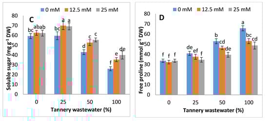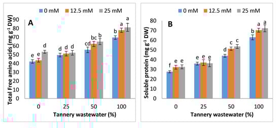 The up-regulations in concentration of the soluble protein and total free amino acids were noticed with the foliar application of Zn-lys, under tannery wastewater treatment in maize plants. Compared with control (0% wastewater treatment), the total free amino acids and soluble protein contents gradualy increased by 10%, 31% and 64%, and 18%, 61% and 122%, at 25%, 50% and 100% tannery water treatment. In addition, the soluble sugars increased by 8% at 25% tannery wastewater, whilst being reduced by 18% and 45% at 50% and 100% tannery wastewater, respectively. On the other hand, the free proline contents increased with the progression of the application dose of tannery wastewater, i.e., increased by 14%, 39%, and 68% at 25%, 50% and 100% tannery wastewater, as compared with control. Overall, total free amino acids, soluble sugars, soluble protein and free proline were examined to be high in plants treated with the foliar spray of Zn-lys, as compared to plants without any Zn-lys application (Figure 5).