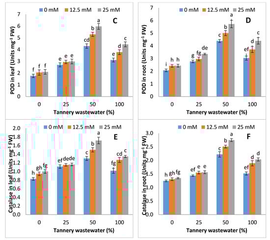 Graphs showing effect of foliar spray of zinc chelated lysine (0, 12.5, 25 mM) on superoxide dismutase (SOD), peroxidase (POD) and catalase (CAT), in leaves (A,C,E) and roots (B,D,F) of maize plants growing under 0%, 25%, 50%, 100% concentration of tannery wastewater. Value are means of three replicates. Statistical analyses were carried out by ANOVA, followed by Tukey’s Post-Hoc test.