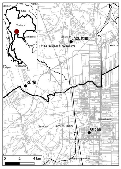 There were three sampling areas (industrial, urban, and rural) in Thailand (Figure 1). The industrial area is in Wat Klong Phut-Sa near the Bangpa-in Industrial Estate in Phra Nakhon Si Ayutthaya Province. There are 109 factories in the Bangpa-in Industrial Estate area which is divided into five areas: Industrial Area, Free zone, Commercial and Residential area, Utility area and facilities, and Green area. The urban area was found at the Rangsit campus of Thammasat University, which was in Khlong Luang, Pathum Thani, 42 km North of Bangkok. The campus is divided into three areas: academic zone, housing zone (dormitories), and various sport facilities. The rural area was in Wat Pho Teang Nuea in Pho Taeng, Bang Sai, Phra Nakhon Si Ayutthaya. It is nearby the Chao Phraya River. Sacred fig (Ficus religiosa) and indian medlar (Mimusops elengi) were chosen because these species were found in all three sampling areas (industrial, urban, and rural). Three individual trees were chosen randomly from each species, and 15 leaves were collected from each tree at 1.5 m high. Thus, we collected 90 leaves per sampling sites. At each sampling site, six soil samples were collected at a depth of 0–20 cm along the urbanization gradient from each sampling area from the same micro-location near the selected trees.