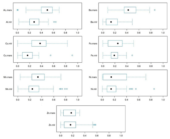 As BAF is the indicator of the accumulation, and as humus content and the level of polymerization of the organic matter is the most important organic colloid of the soil, revealing their relationship is important. We proved the relevance of humus materials in case of Al, Ba, and Cu (R2 medians > 0.4), while in the case of Fe and Mn, the R2 medians were around 0.2, but the interquartile range indicated that the models can be more accurate in several cases. The relationship was the weakest in the case of Zn, with lowest upper quartiles. Results also pointed to the relevance of a robust approach, which came from the distribution: MARS was a better predictor algorithm than MLR. Splitting the database resulted in non-linear connections between the humus and the studied elements; thus, the MARS algorithm having no assumptions on distribution on the input data was more successful with better performance (Figure 5). Better performance of MARS had been proven in other studies too [69,70], and we also found it an effective prediction tool and, in this case, a technique for better exploration of relationships among different variables.