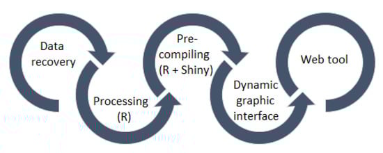 A flowchart of the methodology followed is presented in Figure 1. Initially, the data is recovered from the official site of the National Governments Health Secretary of Mexico. A processing to these data is applied using the software R and, subsequently, a pre-compilation is performed the R package, Shiny. Then, the dynamic graphic interface is developed based on the previous steps and, finally, the web tool is obtained.