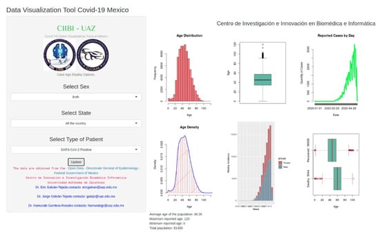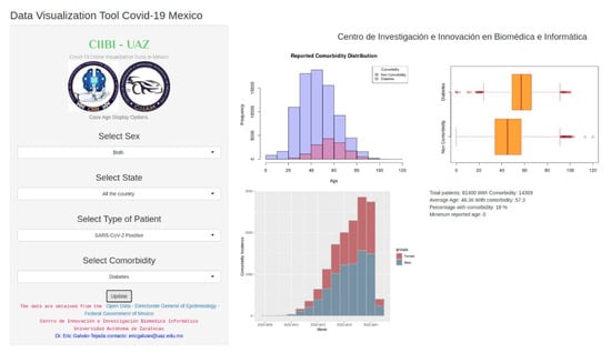 To our knowledge, this is the first free online tool to analyze the demographic and comorbidities characteristics for the Mexican population related to COVID-19. The current available tools presenting similar approaches are international projects [,], none of them focusing on Mexico, and they have not yet linked cases of COVID-19 to comorbidities, nor has age been taken into account for the analysis of the disease, which are some of the contributions of this work.