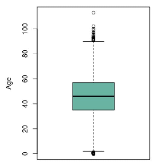 In Figure 5 is presented the boxplot obtained from the same subjects sample selected as in the previous graph. The black line in the middle of the box representes the median age of the population with presence of COVID-19. The horizontal edges of the box represent the lower and upper quartiles, and the short lines that are at the ends of the projecting lines of the boxes represent the minimum and maximum age presented by the subjects. The small circles that exceed the maximum and minimum limits represent the outliers, which are the cases of the subjects that presented an atypical age among the population with the disease.