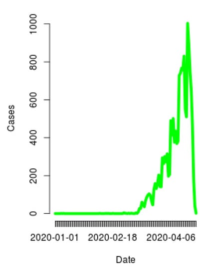 - Jombart, T.; Kamvar, Z.N.; FitzJohn, R.; Cai, J.; Bhatia, S.; Schumacher, J.; Schumacher, J. Package ‘Incidence’. Compute, Handle, Plot and Model Incidence of Dated Events. 2020. Available online: https://cran.r-project.org/web/packages/incidence/incidence.pdf (accessed on 29 April 2020).