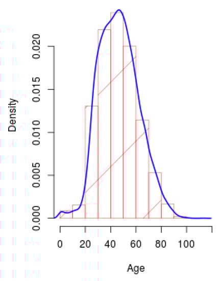 Figure 7 shows the density plot of the population with presence of COVID-19 from all the territory. The red bins represent the number of subjects for each age range, while the blue line represents the envelope of the bins. The envelope allows to see in a smooth way the distribution of the subjects according to age.